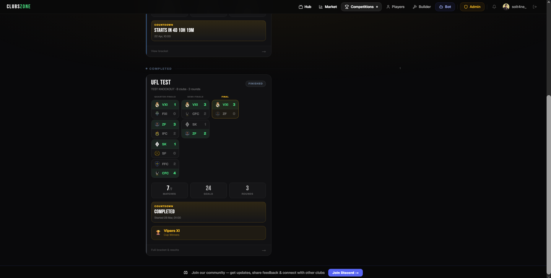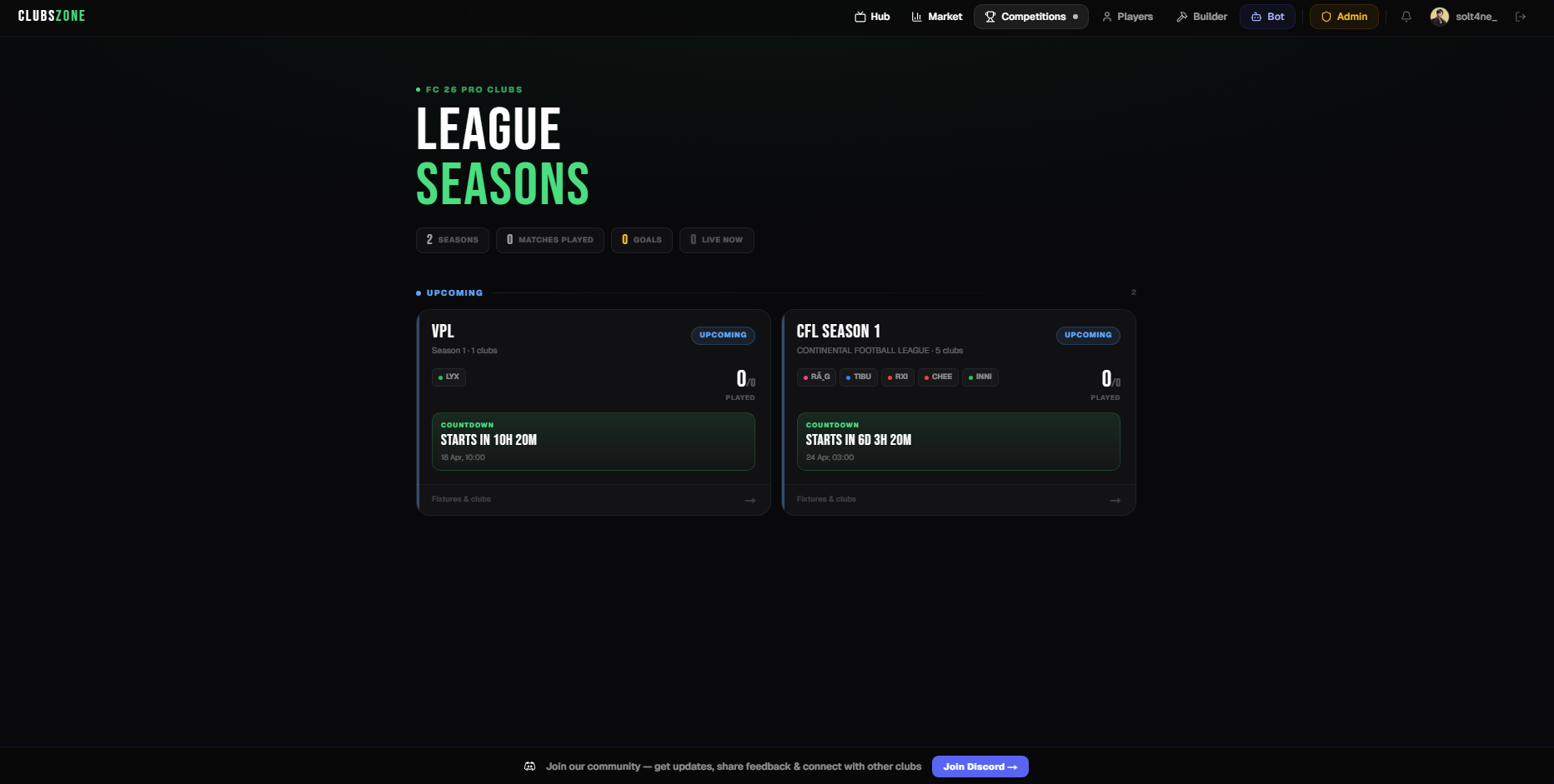 Click the avatar icon in the top-right corner of the navbar and complete the Discord OAuth flow. Your Discord identity becomes your ClubsZone login — no separate password needed.